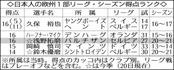 パルチザン浅野 欧州1部日本人最多タイ16ゴール目 代表戦も期待