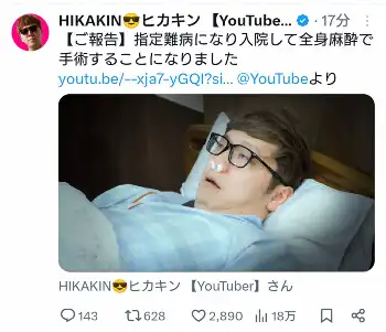ヒカキンから重大な【ご報告】「指定難病になり入院して全身麻酔で手術することになりました」
