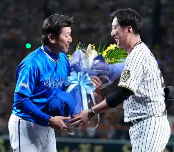 今季で退任のDeNA三浦監督 3連敗終戦後に阪神・球児監督から花束、甲子園ビジョンにも「ありがとう」