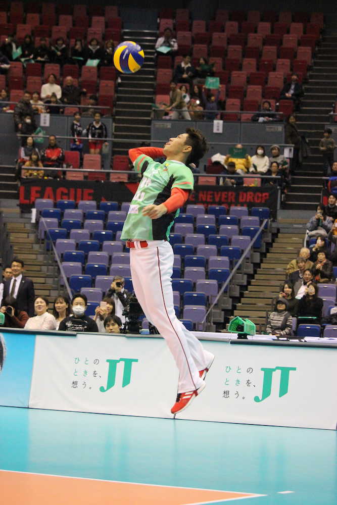 バレーボールVリーグのJTサンダーズ対FC東京の始球式でジャンピングサーブをみせる中村奨