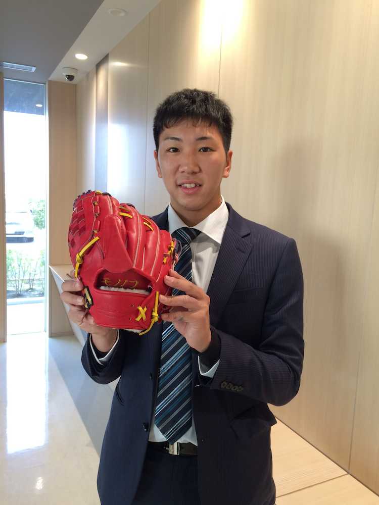 「ももいろクローバーZ」のファン「モノノフ」でリーダー百田夏菜子推しの左腕は、大学時代から使用する特製ももクログラブを紹介。ボディ部分は百田のイメージカラー・赤、ヒモはピンク、黄色、紫とももクロカラーでまとめたものだ。ソフトバンクのモノノフは育成スタートだった石川が有名だが、「尊敬している。ラインに立って、超えられる投手になりたい」と“左の石川”を目指す。