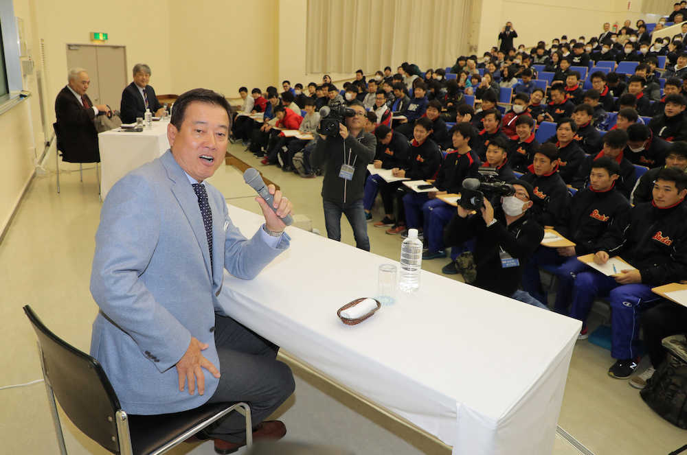 原監督の持つ、独特の「言葉力」で表現した。FA移籍と人的補償。真剣に耳を傾ける生徒の前で、計算式に例えた。