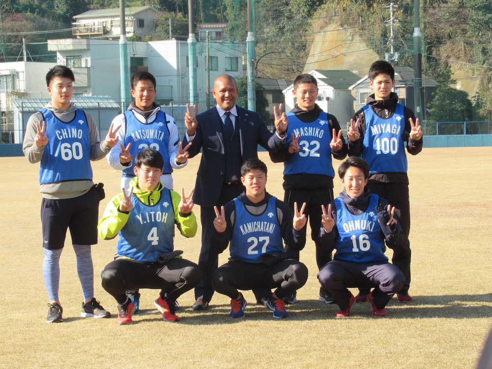 新人合同自主トレ初日に、視察に訪れたDeNAラミレス監督とルーキーがポーズを決める