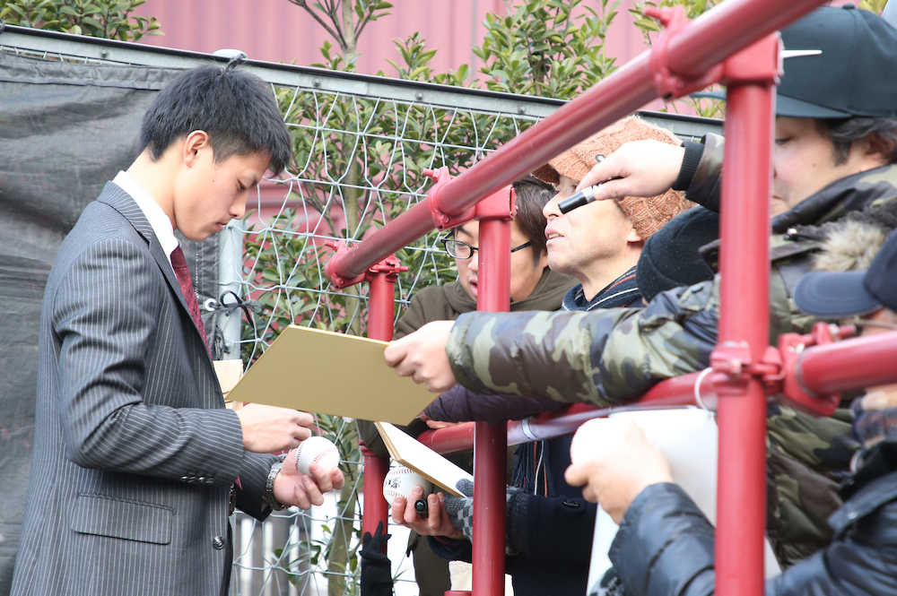 ファンにサインする辰己(撮影・三島 英忠)