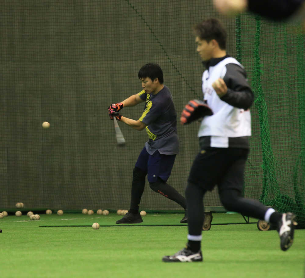 ドラフト1位の高橋(右)がノックを受ける中、黙々とマシンを相手に打ち込む丸(撮影・森沢裕)