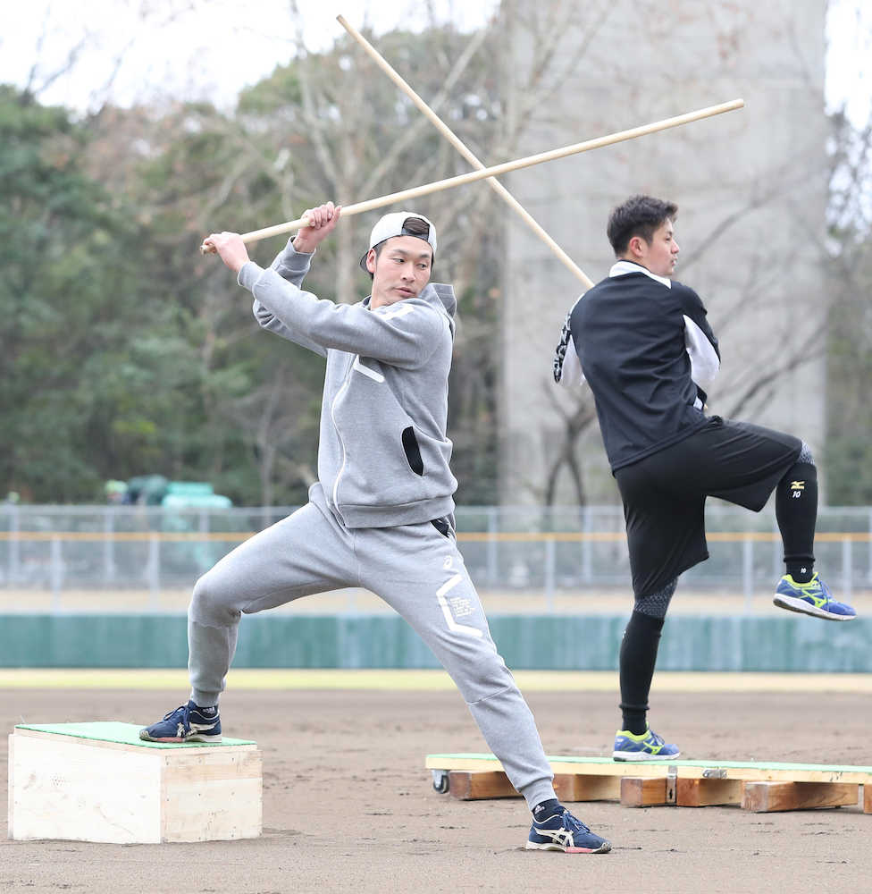目的は本塁方向へ力が最も伝わるフォームの確立で、武田は「ボックス、ギプス、平均台は三種の神器。いろいろ考えてフォームを固める」と説明。「最低でも2桁は勝ちたい」と先発投手としての活躍を期し、大竹も「開幕ローテーションに食い込みたい」と意気込んだ。