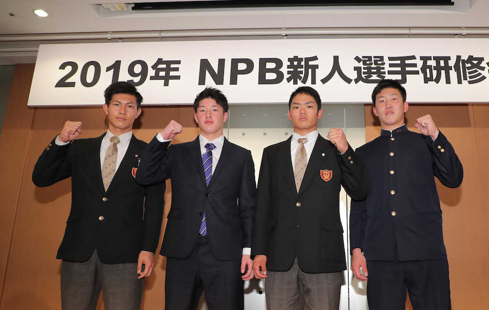 研修会を終え、ガッツポーズの(左から)ロッテ・藤原、日本ハム・吉田輝、中日・根尾、広島・小園(撮影・島崎忠彦)