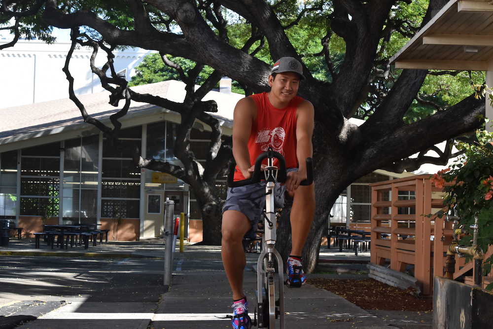 笑顔でエアロバイクを漕ぐ巨人・菅野