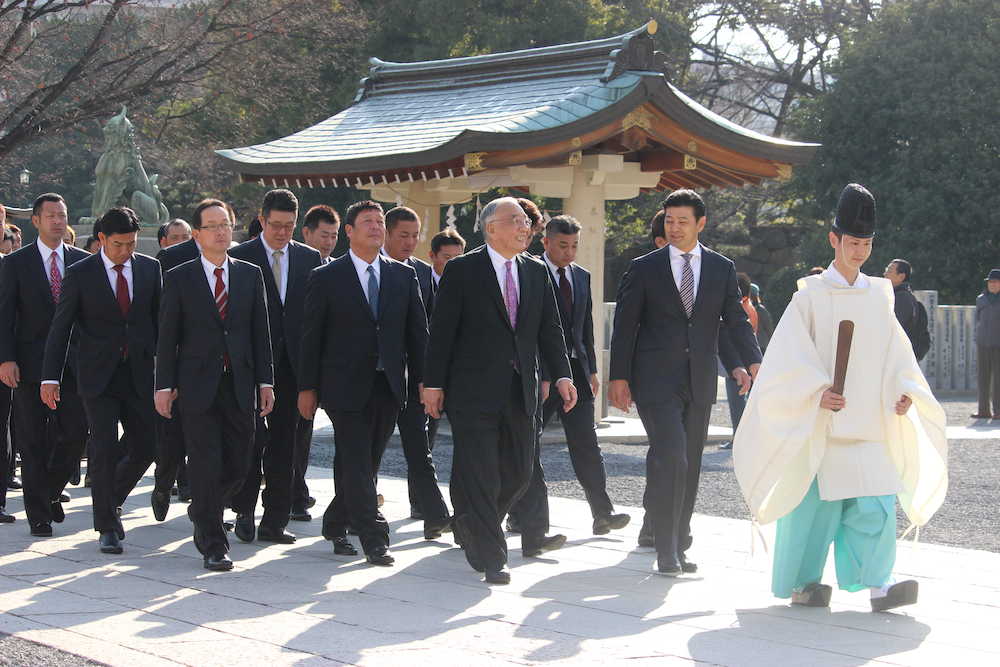 必勝祈願で護国神社を参拝した緒方監督(右から2人目)ら広島球団スタッフ
