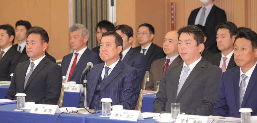 都内ホテルで行われたスタッフミーティングに集まった(左から)高田2軍監督、原監督、井上3軍監督、宮本1軍投手総合コーチ