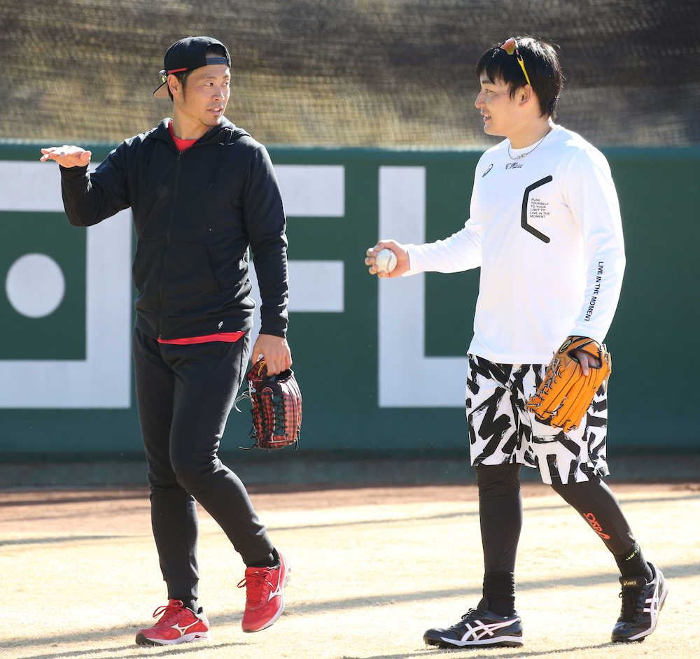 キャッチボールは移籍後初めて会った亀井と行い「相手チームから見て、亀井さんは凄く考えて野球をやられていると感じていた。そういった考えを聞いてみたい」と話した。亀井は丸の印象について「好青年。日本一になるために来てくれた。互いにチームの力になれるように」と語った。