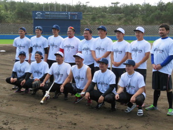 1月中旬。楽天・今江の自主トレ公開で沖縄県恩納村にある球場を訪れた。ロッテの伊志嶺や中村、広島の田中広といった顔ぶれが、全員おそろいのTシャツをキャップ姿でキャンプインに向けて汗を流す。白いTシャツの胸には「2019 TEAM OHMATSU」のロゴがプリントされていた。