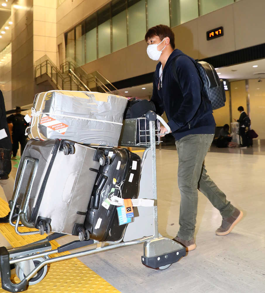 中日・松坂はマスク姿で到着ゲートに姿を現し「飛行機ではあまり眠れなかった」と言いながら笑顔をのぞかせた。