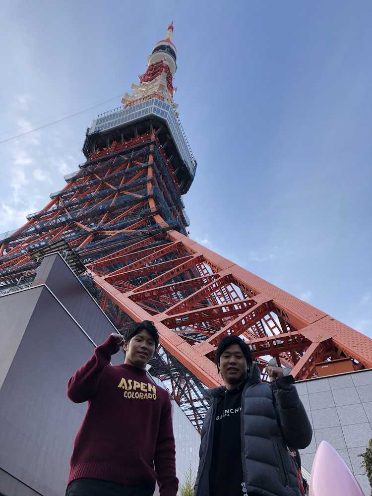 ラジオ収録を行った東京タワーを前に写真に収まる大城と鍬原