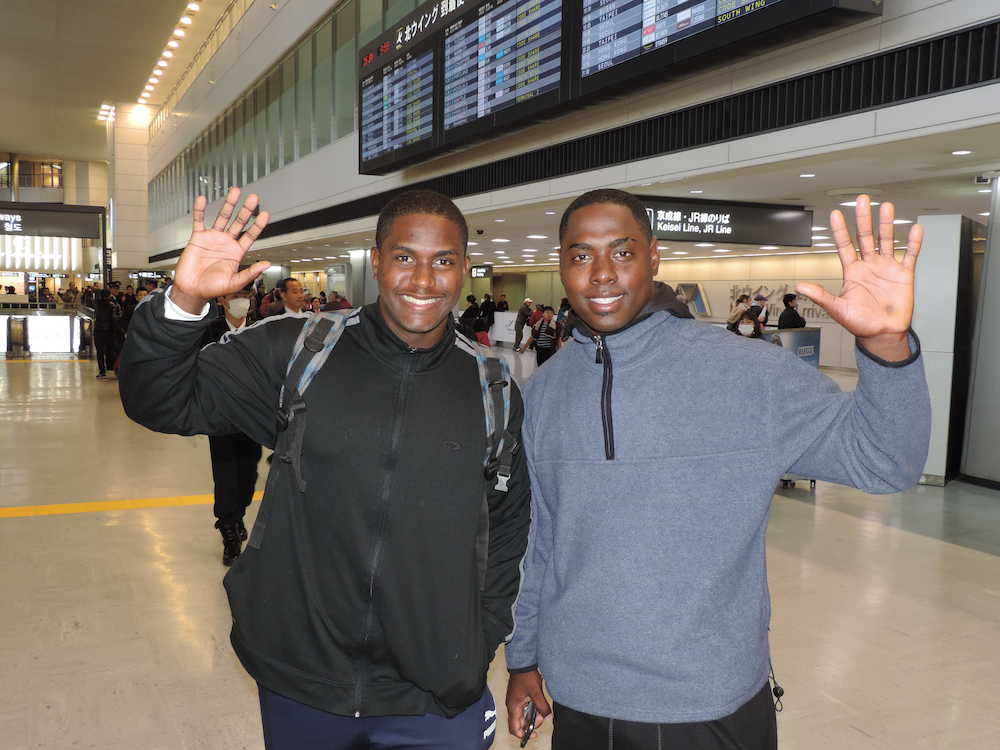 巨人の新育成選手のイスラエル・モタ外野手(23)とレイミン・ラモス投手(22)が26日、成田空港着の航空機で来日した。