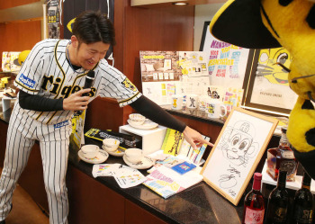 岩貞祐太投手(27)、北條史也内野手(25)が参加して、新作グッズなどをPRした。目玉商品は限定3個の「純金フィギュア トラッキー」で価格は税込み100万円。これには岩貞も「100万円ですよね?今日は1個いただけると聞いてますが…」と周囲を笑わせた。