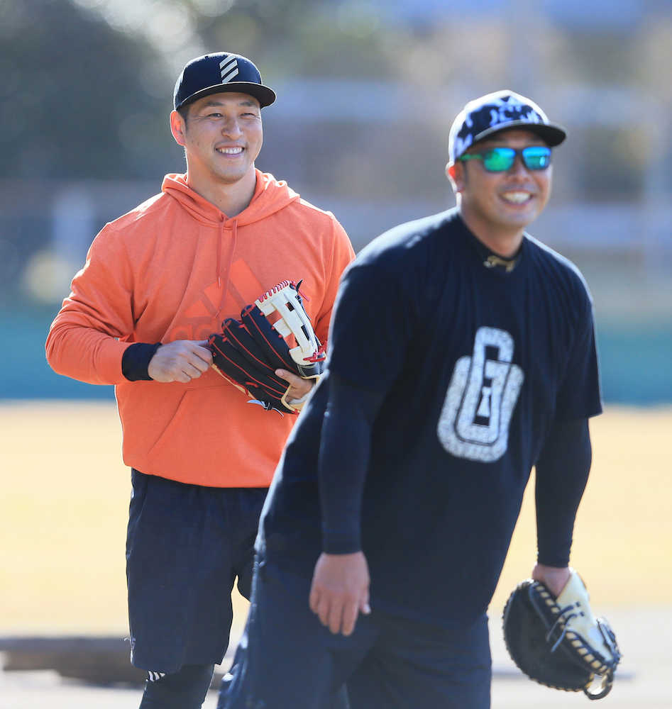 巨人・丸 宮崎で合同自主トレ開始 同じく新加入の中島とキャッチボール
