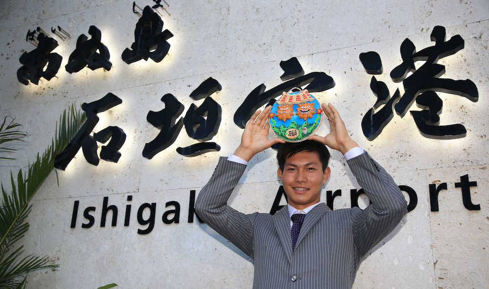 石垣島入りしてシーサーのグッズを手にポースする藤原(撮影・白鳥 佳樹)