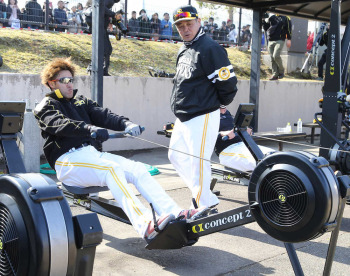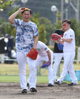 <ロッテ 石垣島キャンプ>入団会見を終えたレアードはグラウンドに姿を現しチームメイトと握手をかわす (撮影・白鳥 佳樹)