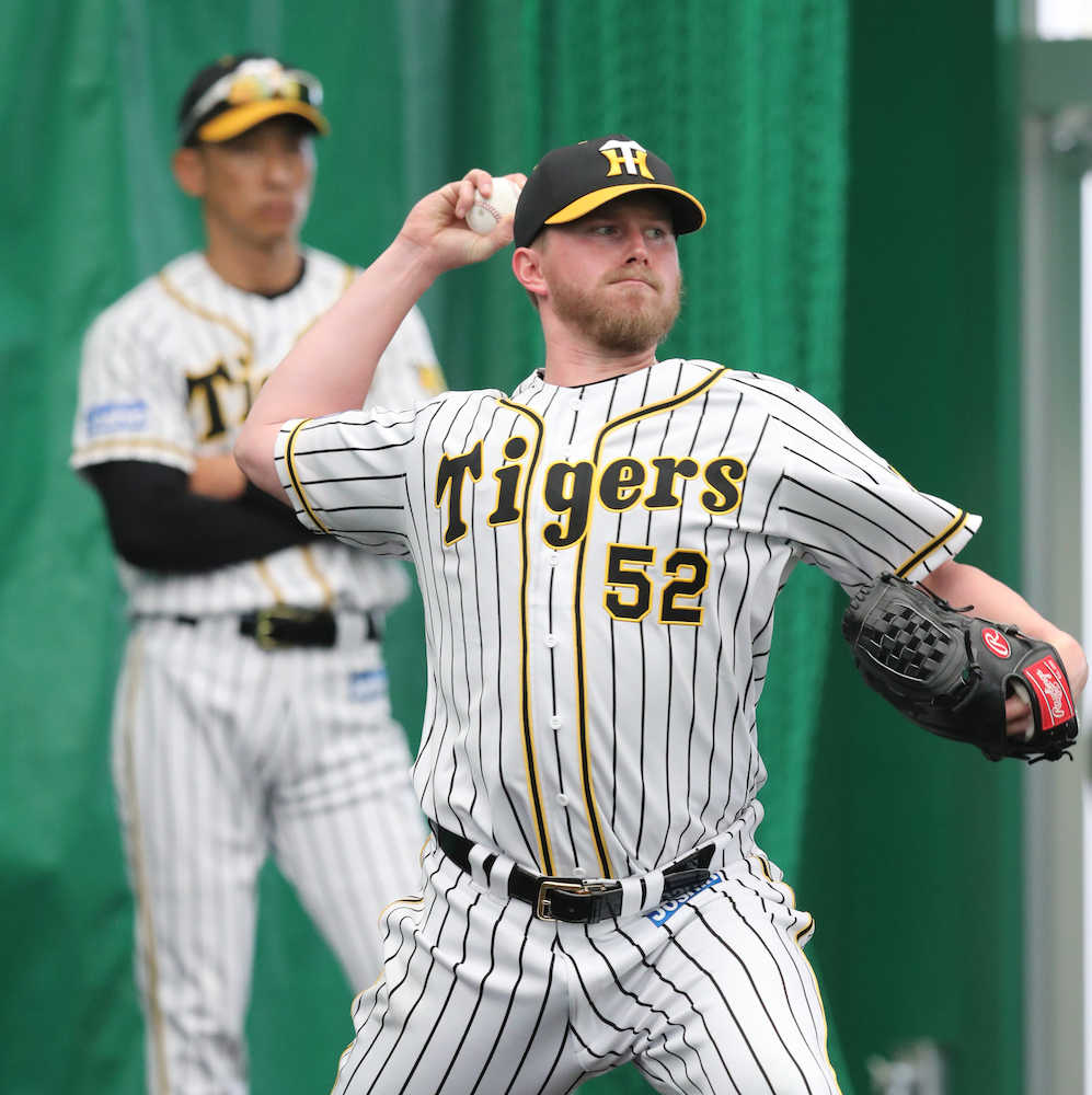 アベレージで150キロを超えるという直球に、ブレーキの利いたカーブ、カットボールを試投。力の配分を「80〜85%」と話したが、威力も制球力も抜群だった。投球後は矢野監督や福原投手コーチ、金村投手コーチらと談笑。「(監督からは)良かったよ。いい感じで投げられている。早くゲームで見たい、と言ってもらえた」と喜んだ。
