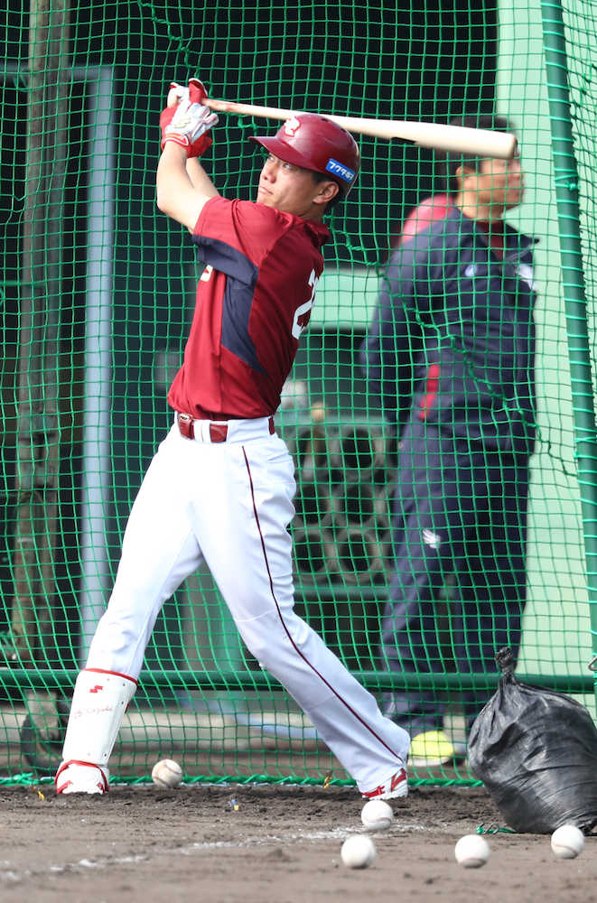 「シーズンでも僕は右翼に強いヒットは少ない。引っ張って右翼方向に強い打球を打つ」と目的意識を持ち、スイッチヒッターながら特打は全て左打席。約150スイングで場外弾2発を含む柵越え25本を放った。「(スイングの)フィニッシュで足がピタッと止まった時は、反対方向の風でも飛距離が出ました」。昨季の新人王は手応えを感じていた。