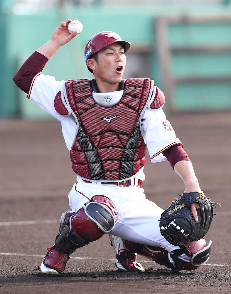 今季から捕手に再挑戦。けん制やバントシフトの練習後、ブルペンで則本昂らの球を受けた。「戸惑いしかない。(則本昂は)球が超速くて、何度もミットを持って行かれた」。有事の際のオプションを増やす存在。今後も外野手との「二刀流」で調整する。