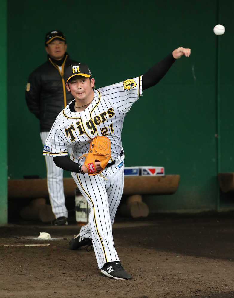 平田2軍監督(後方)が見守る中、ブルペンで投球練習を行う岩田(撮影・成瀬 徹)