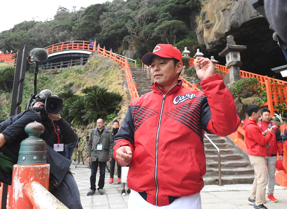 <広島キャンプ>鵜戸神宮を訪れ運玉を投げる緒方監督