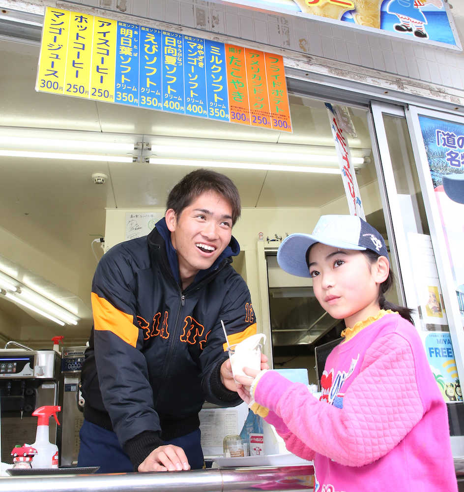 キャンプ休養日に、巨人のドラフト1位・高橋(八戸学院大)が道の駅フェニックスの「駅長」を務めた。マンゴー味などのご当地ソフトクリームを、地元小学生に手渡すなどし「触れ合えてリラックスできました」と笑顔。