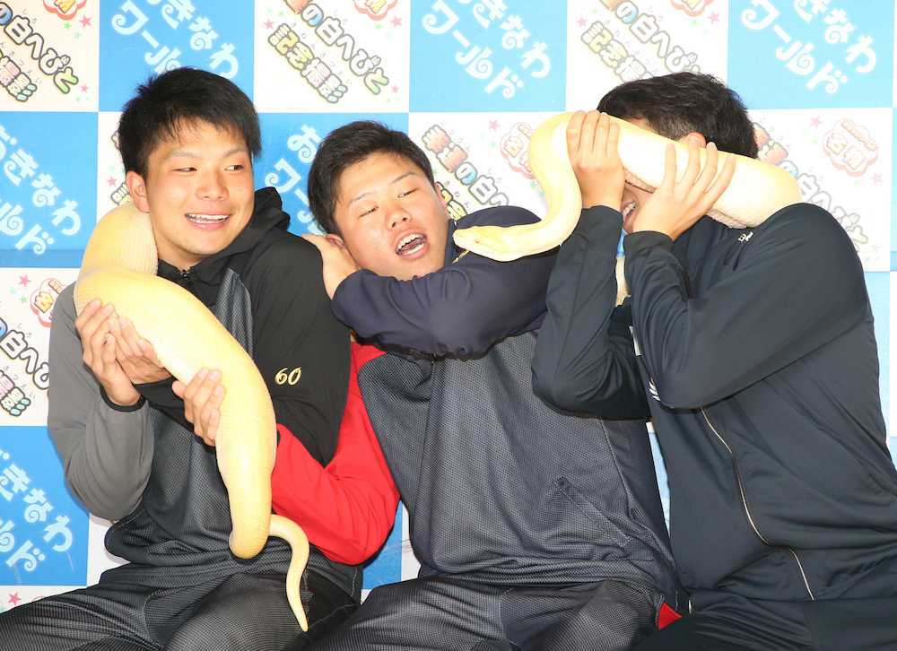 全長3メートル、体重20キロもある白蛇に表情を引きつらせた上茶谷だったが、浜口、東と2年連続で2桁勝利を挙げ幸運を呼んでいる儀式だけに「その波に乗って頑張っていきたい」と話した。