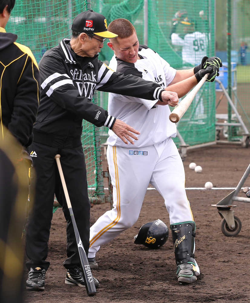 ソフトバンクの王貞治球団会長が、今キャンプで初めてB組の練習を視察した。2年目の育成選手、砂川には付きっきりで指導し「パワーがあって飛ばす力がある。芯で打つ確率を高めること。あとは試合でどう対応できるか」と話した。