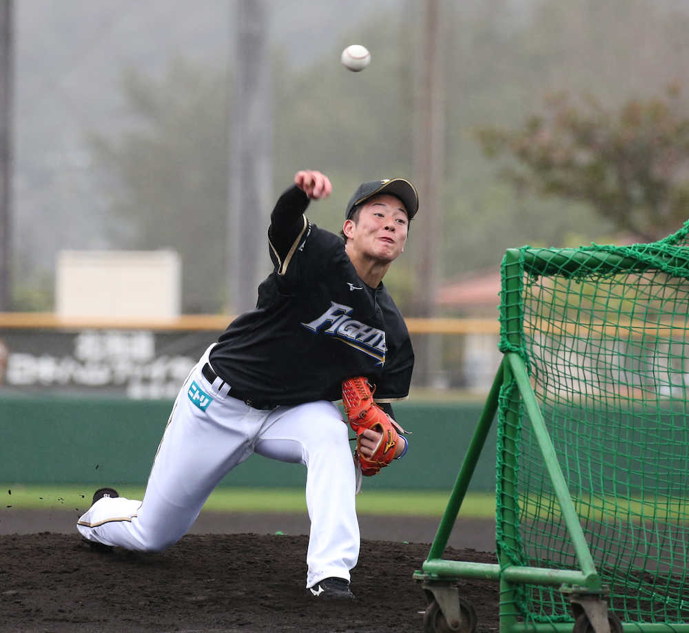 日本ハムのドラフト1位・吉田輝(金足農)が沖縄県国頭村の2軍キャンプでプロ入り後初めて打撃投手を務め、2位の野村(花咲徳栄)と対戦。25球を投げ、14球がボールとなったが、安打性の当たり1本に抑えた。