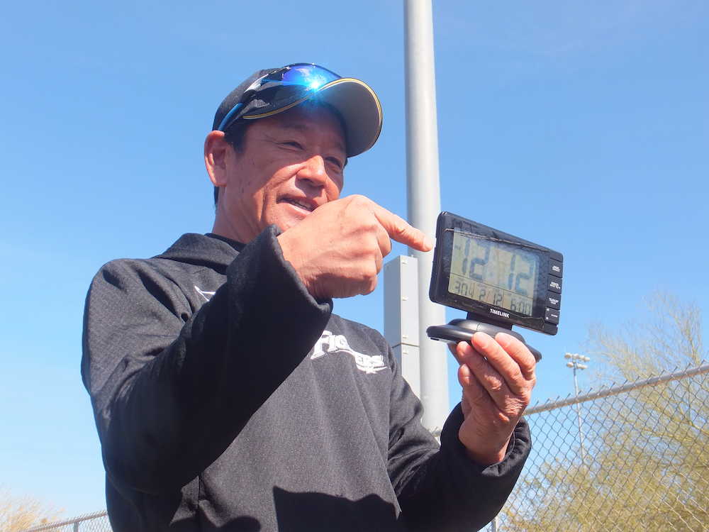 現地時間12日の12時12分を表示する時計を持って笑顔の日本ハム・栗山監督