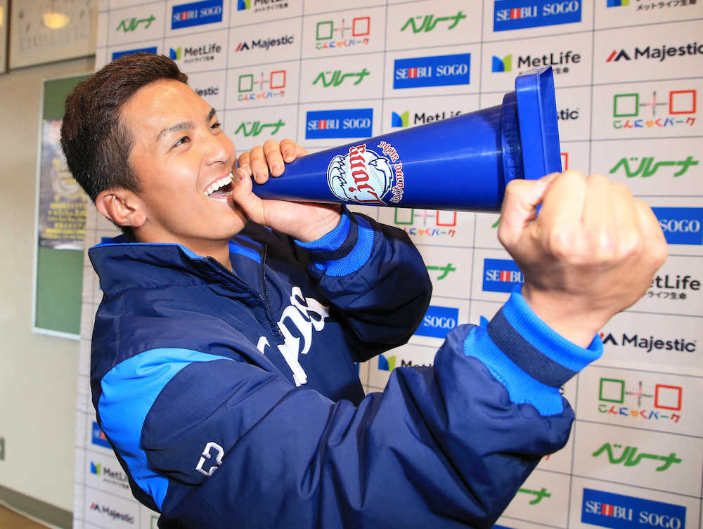 「獅子男〜!」西武・山田が三角コーンメガホンPR 4・13オリックス戦で配布