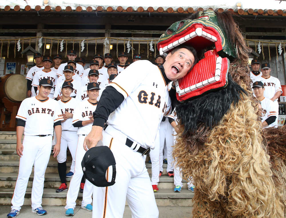 沖縄入りした巨人ナインは沖宮(おきのぐう)を参拝し、必勝を祈願した。原監督は獅子舞に出迎えられ、頭をかまれて笑みを浮かべた。