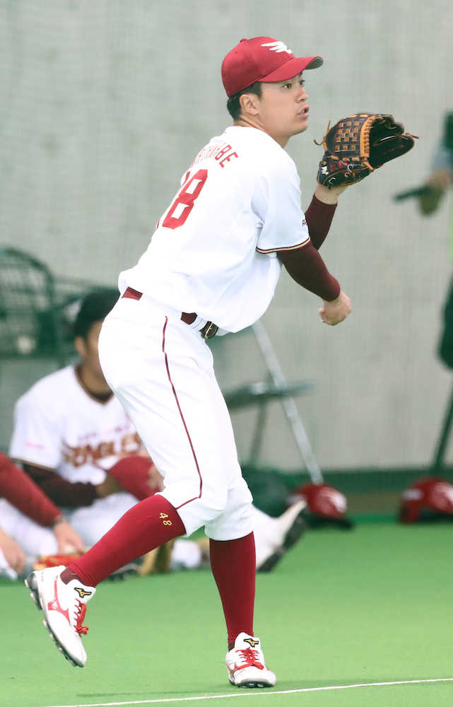 楽天のドラフト6位の渡辺佳(明大)が16日、ロッテとの練習試合(金武)で、プロ初アーチを放った。