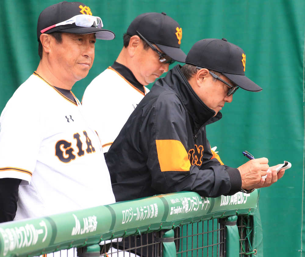 <練習試合 巨人・DeNA>試合中にメモを取る原監督(右)。左から宮本コーチ、吉村コーチ(撮影・森沢裕)