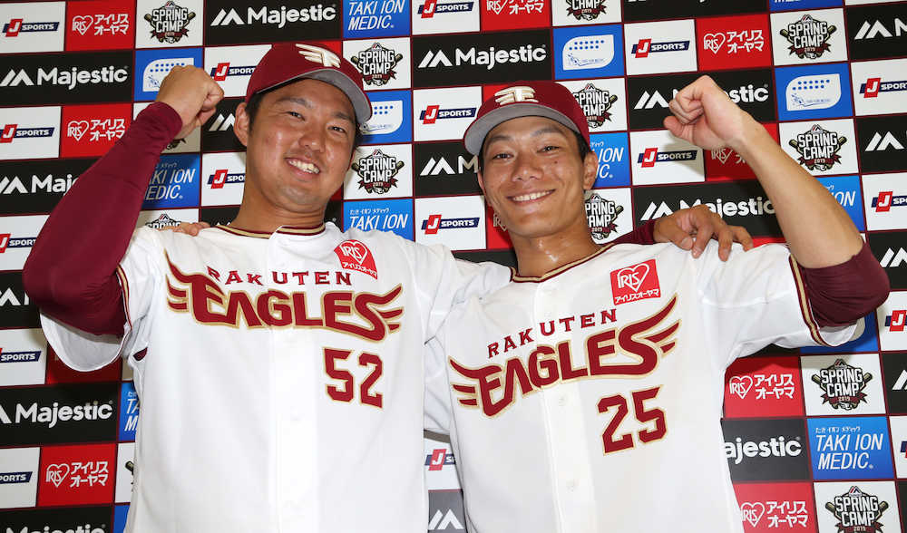 侍ジャパンに選出され笑顔を見せる楽天・森原(左)と田中(撮影・三島 英忠)