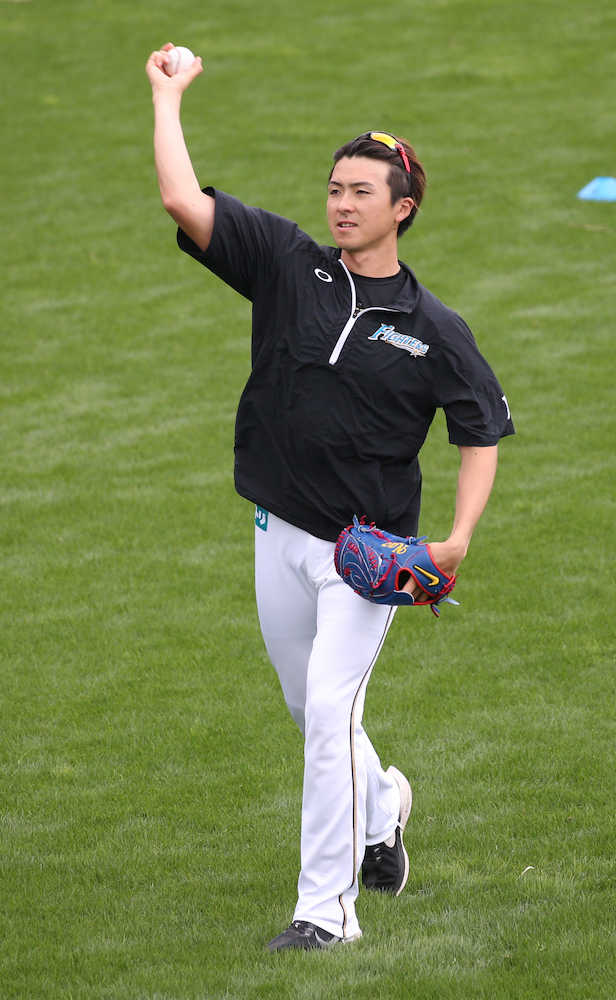 <練習試合 サムスン・日本ハム>試合前、キャッチボールする上沢(撮影・西海健太郎)