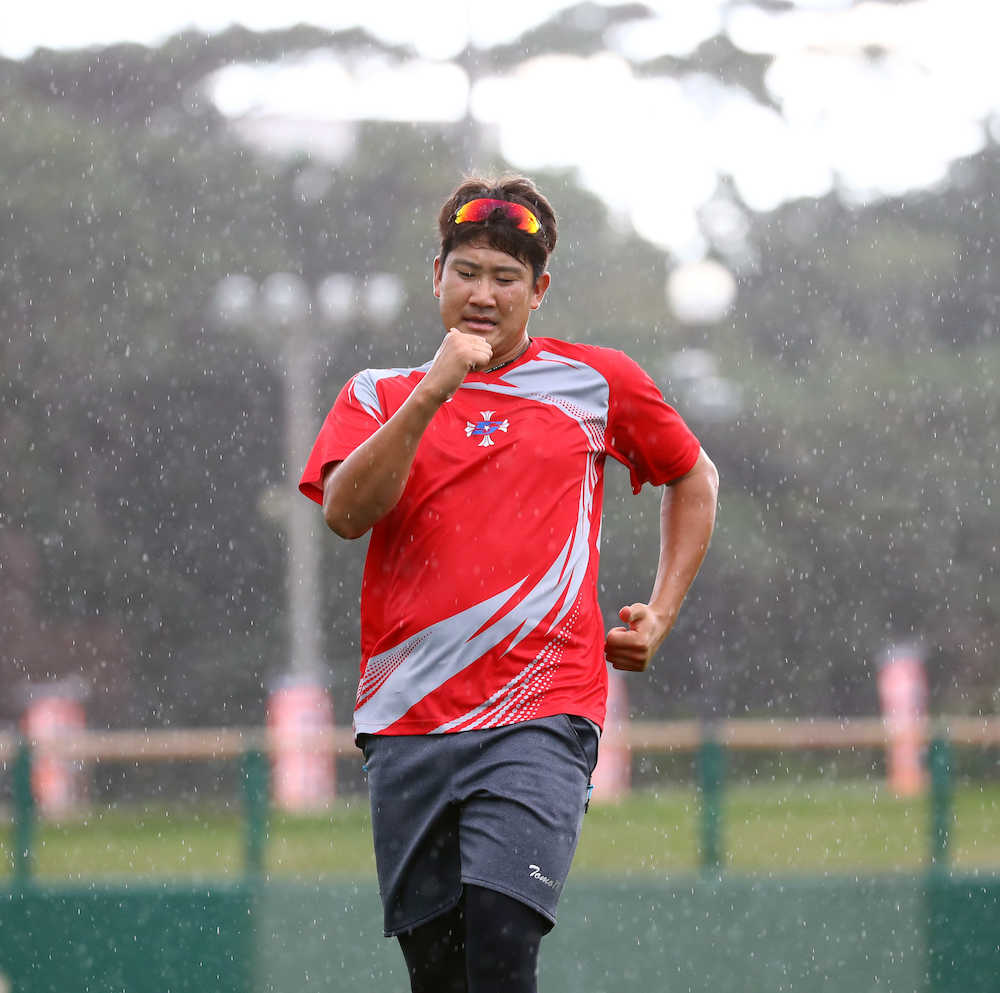 <巨人練習>雨の中ダッシュする菅野(撮影・三島 英忠)