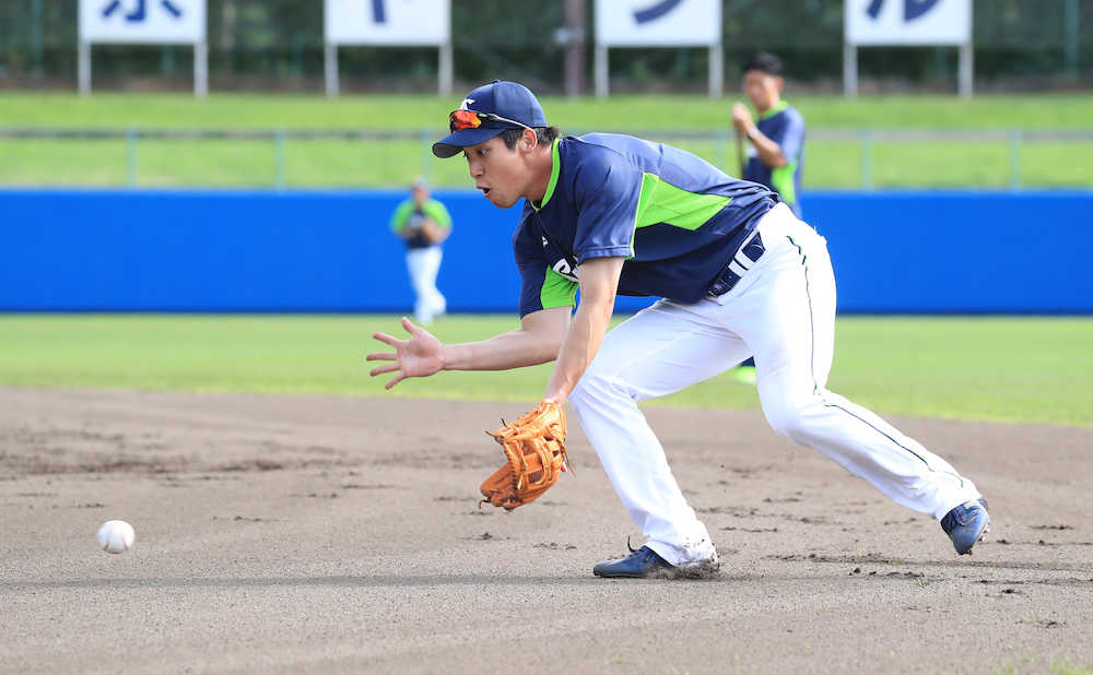 昼過ぎまで降り続いた雨が止んだ午後4時頃。強烈な西日と湿気の中、約40分間。二塁のポジションでノックを受け続けた。「きょうは開始5本で死んだ」と終了直後は体力が底をつき、立ち上がれないほどだったが「でも、失策は1、2個かな。球際は意識した」と充実の表情を浮かべた。