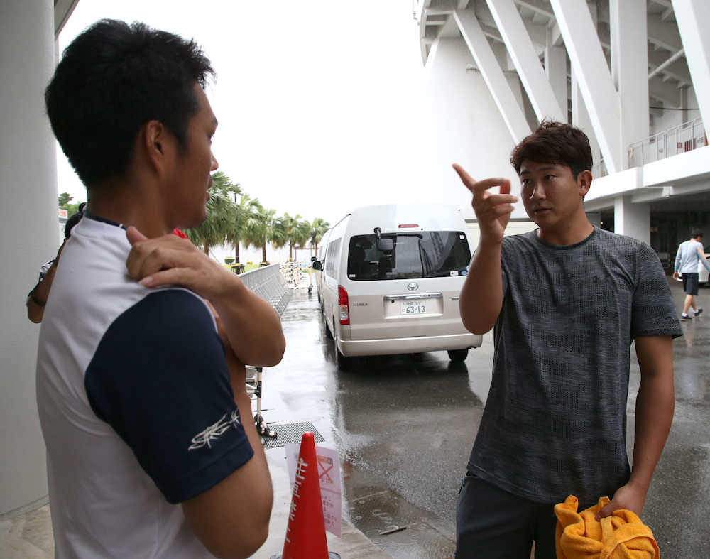 巨人と楽天の選手たちが体を動かす沖縄セルラーに隣接する室内練習場に大きな声が響いた。「則本さん、お先に失礼します!」。1学年年上の菅野が声を張り上げると、後輩の則本昂は慌てて猛ダッシュ。オープン戦開幕戦で投げ合う両者が、がっちりと固い握手を交わした。