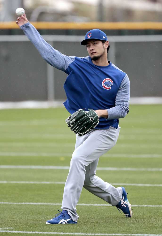 キャッチボールするカブスのダルビッシュ
