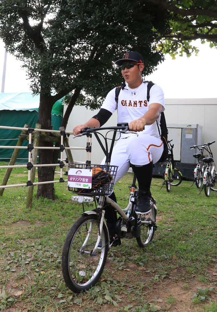 別メニュー調整の岡本は自転車でスタジアムに戻る(撮影・森沢裕)