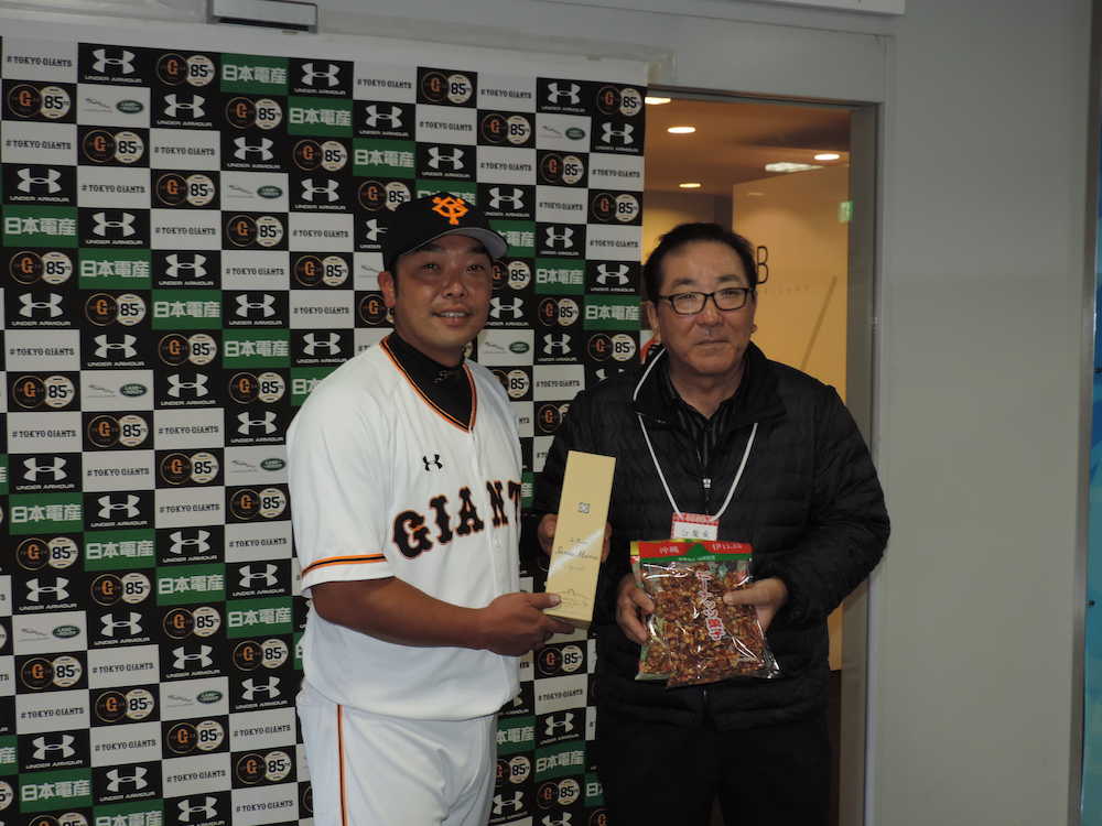 試合前には、自主トレで訪れる沖縄・伊江村の島袋秀幸村長(66)から名産のラム酒などを贈呈された。伊江島にちなみ、あと1本に迫る通算400本塁打達成時に「イエーイ」と叫ぶ公約も改めて確認した。