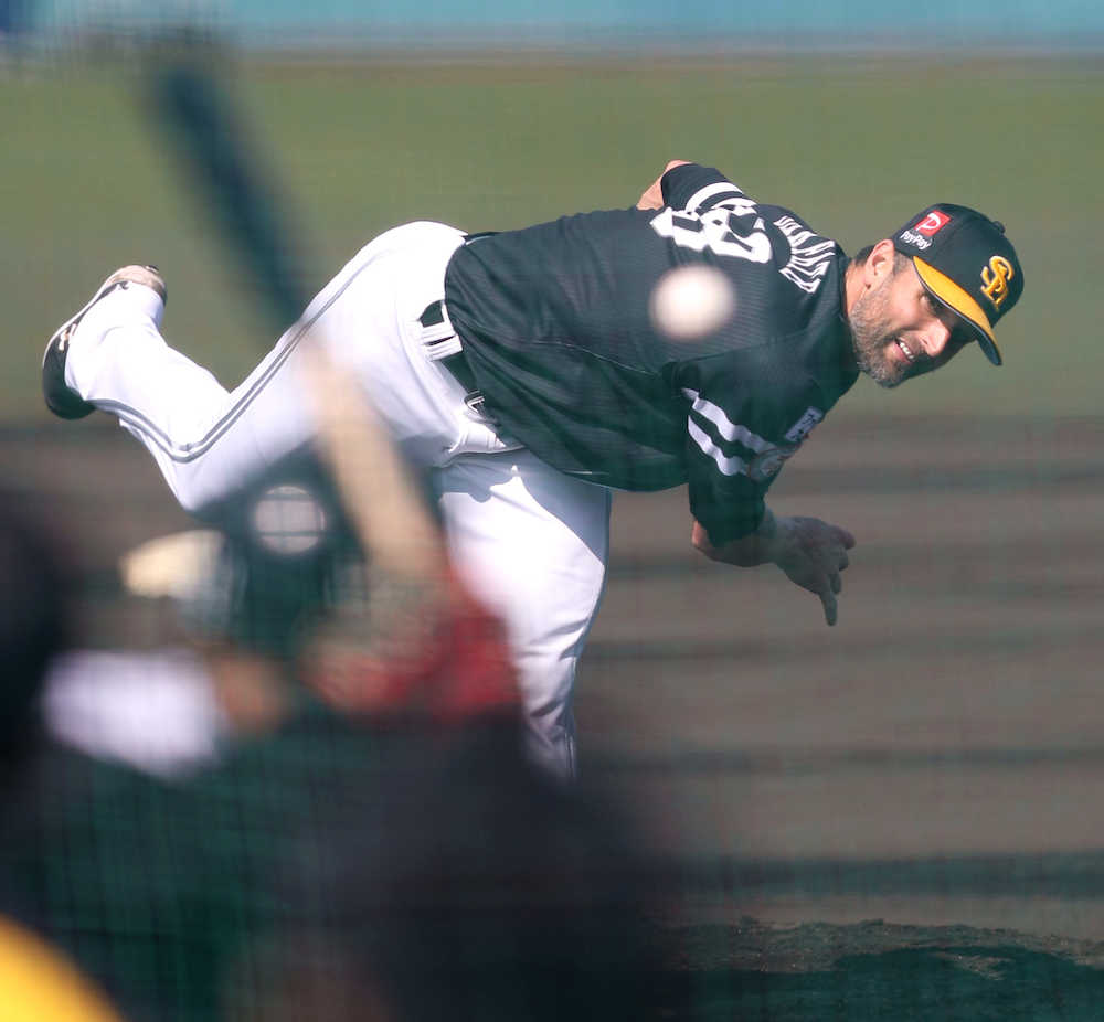防球ネットを置かずに、セットポジションからテンポ良く投げ込んだ助っ人右腕。気温15度の中、半袖姿で腕を振り「(ネットが)前にあると邪魔なので。ネットを置くくらいなら打球が当たった方がマシ」と笑った。