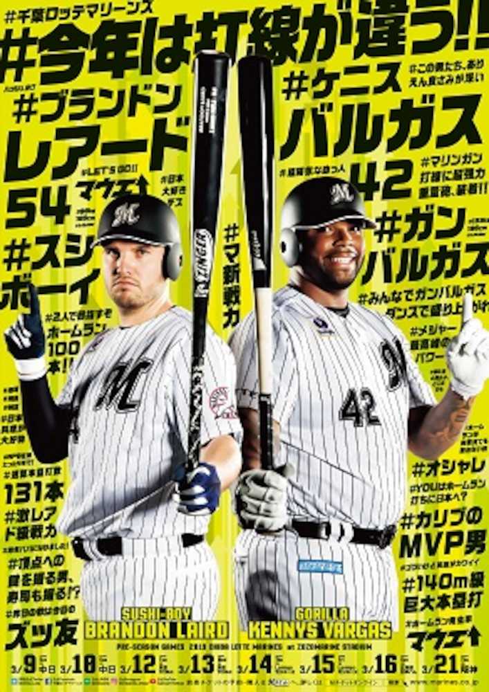ロッテのオープン戦日程を告知する3月の球団ポスターにレアード、バルガスの両外国人を起用することになった。3月のポスターは新人選手を起用してきたが、16年のリーグ本塁打王で「寿司好き」のキャラクターとして人気のレアード、メジャーで飛距離147メートルの超特大本塁打を放ち、「ゴリラパフォーマンス」でも注目度が高いバルガスを全面に出し、超強力打線を売りにする。