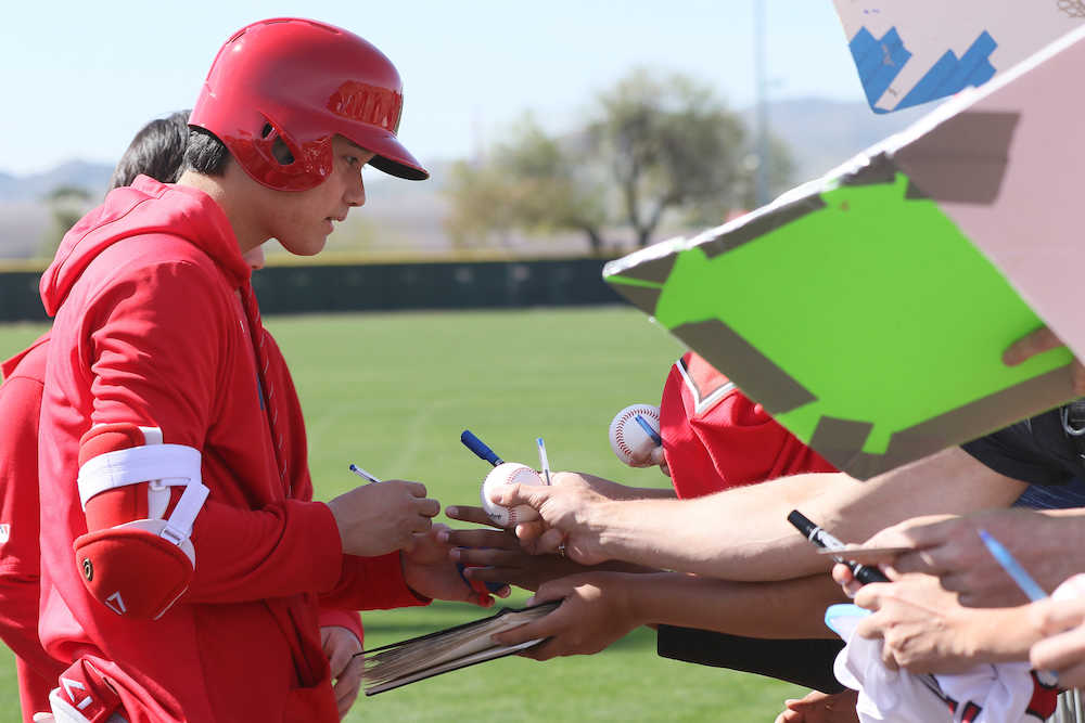 練習後のグラウンド移動時にサインを求めるファンが殺到するなど人気はチーム随一。大谷は2日に「順調にも来ている。特に何かつまずいてるところもない」と話しており、早ければ今週中にも室内でコーチに前から投げもらう軽めの打撃練習に移行するとみられる。