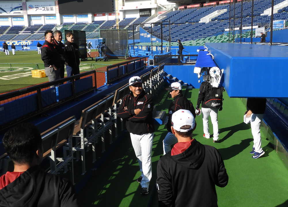 一部改修されたZOZOマリンで5日、ロッテの初の全体練習が行われた。約5メートルせり出したベンチ、最大4メートル外野フェンスが前に出た「ホームランラグーン」などを井口監督、選手らが視察した。