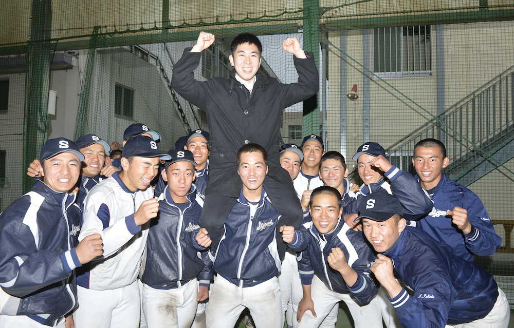 午後0時3分、自宅でパソコンからインターネットで受験番号を見つけると「感激しました。でも、僕以上に母の方が喜んでいました」とはにかんだ。その足で静岡市内の母校へ。栗林俊輔監督(46)に報告すると「おめでとう。神宮で活躍できるよう頑張れ」と背中を押され、群馬大医学部に通う同級生の右腕・竹内奎人投手(19)は、わざわざ帰省中の賀茂郡河津町の実家からお祝いに駆けつけてくれた。現役部員の後輩たちからはドラフト指名時のような胴上げと肩車で派手な祝福を受けた。